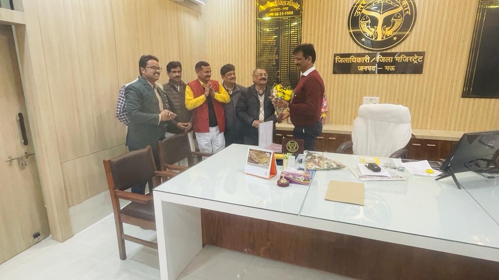 अखिल भारतीय उद्योग व्यापार मंडल जनपद मऊ का एक प्रतिनिधि मंडल जिलाध्यक्ष डा रामगोपाल गुप्त के नेतृत्व में नवागत जिलाधिकारी श्री प्रवीण कुमार मिश्र से कलेक्ट्रेट परिसर स्थित कार्यालय में मिला ।