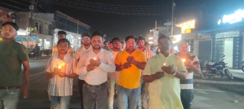 गंभीरपुर/ आजमगढ़। जम्मू कश्मीर के पहलगाम मे हुए आतंकी हमले के विरोध मे गंभीरपुर थाना क्षेत्र के गंभीरपुर बाजार में बृहस्पतिवार की रात्रि 8:00 बजे महेशपुर खंडपालक सतीश कुमार के नेतृत्व में कैंडल मार्च निकाला गया। कैंडल मार्च पुलिस चौकी के बगल से निकलकर पूरे बाजार का भ्रमण करते हुए गंभीरपुर तिराहे पर जाकर 2 मिनट का मौन रखकर समाप्त हुई। कैंडल मार्च में चल रहे लोग पाकिस्तान मुर्दाबाद, आतंकवाद मुर्दाबाद, भारत माता की जय के नारे लगाते रहें। खंड पालक महेशपुर सतीश कुमार ने कहा कि कश्मीर के पहलगाम में घूमने गए टूरिस्ट के ऊपर आतंकवादियों द्वारा जो यह कायराना हरकत की गई है इसकी हम कड़ी निंदा करते हैं और भारत सरकार से यह मांग करते हैं कि आतंकवादियों को उन्हीं की भाषा में समझाएं जिससे कि उनकी आने वाली नस्ल भी इस तरीके की ओझी की हरकत ना कर पाए। इस मौके पर ग्राम प्रधान संतोष कुमार,मनीष मौर्य, राकेश सिंह,अंकित चतुर्वेदी, अनुज गुप्ता, दुर्गा गौण, राकेश मौर्या, निशांत चौरसिया, विकास गुप्ता, पवन गुप्ता, सूरज मौर्या समेत अनेक लोग मौजूद थे।