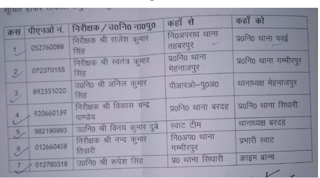 आजमगढ़। पुलिस अधीक्षक अनुराग आर्य ने जिले में कानून व्यवस्था चुस्त दुरुस्त रखने के लिए ट्रांसफर अभियान जारी रखा जिसमें कई थानाध्यक्ष इधर से उधर किए गए हैं।इसी क्रम में आज गंभीरपुर थाना अध्यक्ष नंद कुमार तिवारी का स्वाट टीम (एस ओ जी)मे हुआ स्थानांतरण। वहीं थाना अध्यक्ष मेहनाजपुर स्वतंत्र कुमार सिंह का स्थानांतरण थानाध्यक्ष गंभीर के रूप में किया गया।निरीक्षक राजेश कुमार सिंह का निरीक्षक अपराध थाना तहबरपुर प्रभारी निरीक्षक थाना पवई, उप निरीक्षक अनिल कुमार सिंह का पीआरओ से थानाध्यक्ष मेंहनाजपुर, निरीक्षक विकास चंद्र पांडे का थाना अध्यक्ष बरदह से थाना अध्यक्ष सिधारी, उप निरीक्षक विनय कुमार दुबे का स्वाट टीम से थाना अध्यक्ष बरदह, उप निरीक्षक रूपेश सिंह का थाना अध्यक्ष सिधारी से क्राइम ब्रांच स्थानांतरण किया गया है।