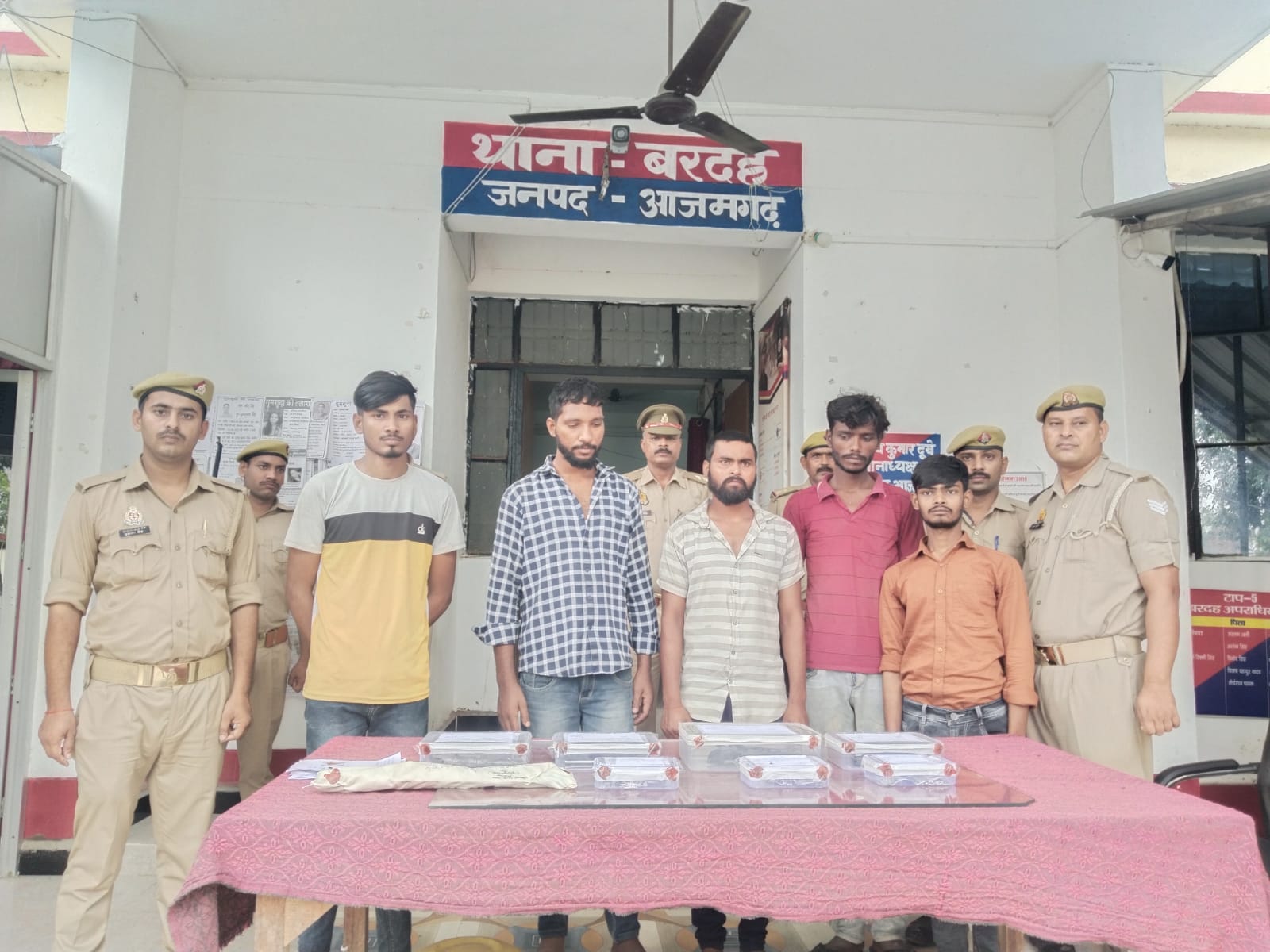 मंगलवार को उ0नि0 विनय कुमार दुबे थानाध्यक्ष मय हमराह, उ0नि0 कमला सिंह मय हमराह, उ0नि0 मानचन्द्र यादव मय हमराह व उ0नि0 जुबेर अहमद मय हमराह द्वारा डकैती की योजना बना रहे अभियुक्तों 1. मो0 उमर पुत्र सुहेल अहमद निवासी चोरसण्ड थाना गौराबादशाहपुर जनपद जौनपुर 2. मोनू पुत्र असरफी निवासी गौराबादशाहपुर थाना गौराबादशाहपुर जनपद जौनपुर 3. हिमाशुं पुत्र मुकेश निवासी बिजौली थाना बरदह जनपद आजमगढ़ 4. संदीप यादव उर्फ गोलू यादव पुत्र रामध्यान यादव निवासी बरदह थाना बरदह जनपद आजमगढ़ 5.अरूण यादव पुत्र गुलाब यादव ग्राम गौराबादशाहपुर थाना गौराबादशाहपुर जनपद को श्रेय जनसेवा केन्द्र व मोबाइल शाप रसूलपुर तुंगी बहद ग्राम रसूलपुर तुंगी से समय 03.30 बजे पुलिस मुठभेड में गिरफ्तार किया गया। गिरफ्तार अभियुक्तों के कब्जे से एक अदद मोबाइल सैमसंग कम्पनी A-23 व घटना में प्रयुक्त एक अदद मोटरसाइकिल अपाची सम्बन्धित मु0अ0स0 402/23 धारा 382/34/411 भादवि थाना बरदह आजमगढ़ व एक अदद तमन्चा .315 बोर व एक अदद जिन्दा व एक अदद खोखा कारतूस .315 बोर व एक अदद तमन्चा 303 बोर व एक अदद जिन्दा कारतूस 303 बोर, तीन जोड़ी पायल सफेद धातु (चांदी की पायल) व 1500/- रूपया माल मसरूका सम्बन्धित मु0अ0सं0- 373/23 धारा 380/411 भादवि , व एक अदद लोहे का राड, दो अदद पेंचकस , एक अदद पिलास व एक अदद लोहा काटने वाली आरी व 04 अदद एण्ड्रायड मोबाइल फोन बरामद हुआ । गिरफ्तारी व बरामदगी के आधार पर थाना स्थानीय पर मु0अ0सं0 402/23 धारा 382/411/34 भादवि व मु0अ0सं0 403/23 धारा 307/399/402 भा0द0वि0 व 3/25 व 7/25 आर्म्स एक्ट पंजीकृत किया गया। गिरफ्तार अभियुक्तों का चालान न्यायालय किया गया।