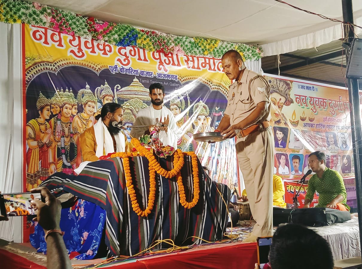 बोगरिया, आजमगढ़। मेहनगर तहसील अंतर्गत बोगरिया बाजार में पुलिस चौकी के बगल में लगभग 45 वर्षों से लगातार पूजा पंडाल में मां दुर्गा की स्थापना की जाती रही है इस वर्ष भी नवयुवक दुर्गा पूजा समिति द्वारा सप्तमी के दिन मां दुर्गा की स्थापना की गई इसके साथ ही पूजा पंडाल में चार दिवसीय श्री राम कथा का शुभारंभ भी किया गया इस कार्यक्रम का शुभारंभ मेहनगर क्षेत्र की वर्तमान विधायक पूजा सरोज व चंद्रा देवी इंटर कॉलेज बोगरिया के प्रधानाचार्य श्री जय प्रताप यादव ने फीता काटकर किया। चार दिवसीय राम कथा में अयोध्या से चलकर आए हुए श्री अमित जी महाराज ने आज दूसरे दिन श्री रामचंद्र जी के चरित्र चित्रण का विस्तार पूर्वक वर्णन करते हुए रामचरितमानस के महत्व के बारे में लोगों को बताया साथ ही साथ शिव पार्वती विवाह का वर्णन भी लोगों ने बड़े ही उत्साह के साथ सुना उन्होंने बताया कि इस जगत में पुरुषों में सबसे उत्तम कहे जाने वाले पुरुषोत्तम श्री राम ही हैं जिनके चरित्र का वर्णन स्वयं ब्रह्मा, विष्णु और महेश भी करते हैं। अतः हम सभी को भगवान श्री राम के चरित्र के समान अपने जीवन में भी स्वयं के चरित्र का निर्माण करने का प्रयास करना चाहिए। इस अवसर पर नवयुवक दुर्गा पूजा समिति पूर्वी के सभी कार्यकर्ता व सैकड़ो की संख्या में श्रोतागण मौजूद रहे।