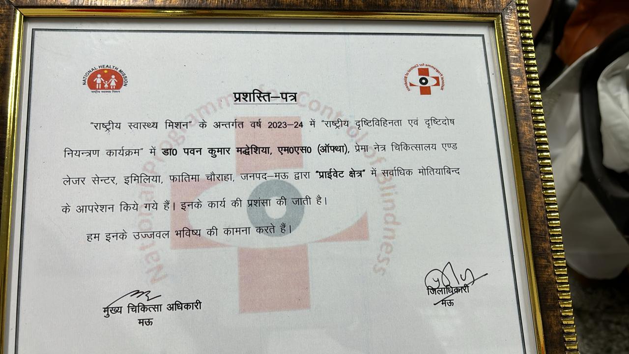 नगर के प्रसिद्ध नेत्र चिकित्सक तथा प्रेमा चिकित्सालय एंड लेजर सेंटर के स्वामी डा पवन कुमार मद्धेशिया को राष्ट्रीय स्वास्थ मिशन द्वारा सर्वाधिक मोतिया बिंद का ऑपरेशन करने के लिए लोकप्रिय जिलाधिकारी द्वारा प्रशस्ति पत्र मिलने से नगर वासियों में प्रसन्नता की लहर दौड़ गई है। राष्ट्रीय दृष्टिहीनता एवं दृष्टि दोष नियंत्रण कार्यक्रम के अंतर्गत डा गुप्ता ने मार्च 2019 से दिसंबर2023 तक 58724 मोतियाबिंद का रिकॉर्ड ऑपरेशन कर जनपद में कीर्तिमान स्थापित किया तथा जनवरी 2024से31मई2024 तक 6784ऑपरेशन किया जो अनुकरणीय है ।इस सुकृत्य से जनपद के जिलाधिकारी श्री प्रवीण कुमार मिश्र ने डा मद्धेशिया को प्रशस्ति पत्र देकर सम्मानित किया।इस अवसर पर जनपद के मुख्य चिकित्साधिकारी समेत दर्जनों अधिकारी गण मौजूद रहे।इस अवसर पर अखिल भारतीय उद्योग व्यापार मंडल जनपद मऊ के अध्यक्ष डा रामगोपाल गुप्त ने खुशी प्रकट करते हुए कहा कि डा मद्धेशिया निश्चित रूप से गरीबों की चिकित्सा बहुत ही सेवा भाव से करते हैं वे धार्मिक सामाजिक तथा चिकित्सीय सेवाओं में निस्वार्थ भाव से असहाय व निर्धन रोगियों के सेवा करते रहते है।आज सभी आशीर्वाद तथा दुआओ का ही परिणाम है कि उनकी कीर्ति चारो तरफ फूलों के सुगंध की तरह फ़ैल रही है।इस अवसर पर मध्यदेशीय वैश्य महा सभा प्रदेश महा मंत्री अभिषेक मद्धेशिया समेत दर्जनों सामाजिक संस्थाओं से डा मद्धेशिया के इस उपलब्धि पर शुभकामनाओं तथा बधाइयों का ताता लगा हुआ है ।