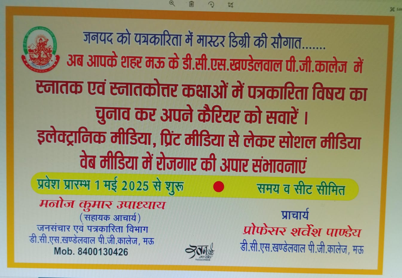 महाराजा सुहेलदेव राज्य विश्वविद्यालय आज़मगढ़ से सम्बद्ध एकमात्र डी सी एस के पी जी कॉलेज मऊ में पत्रकारिता विषय में स्नातक एवं स्नातकोत्तर कक्षाओं में पत्रकारिता विषय का चुनाव कर अपने कैरियर को संवारे। विगत 35 वर्षों से पत्रकारिता विषय का संचालन होता चला आ रहा है, यहाँ से अब तक दर्जनों से ऊपर छात्र-छात्राएं प्रिंट मीडिया से लेकर इलेक्ट्रॉनिक मीडिया के क्षेत्र में अपना करियर संवारने के साथ ही साथ नेट पीएचडी कर शिक्षण संस्थाओं में असिस्टेंट प्रोफेसर के रूप में शिक्षण कार्य कर रहे है। महाविद्यालय के प्राचार्य प्रोफेसर शर्वेश पांडेय जी ने कहा की पत्रकारिता समाज को सूचना देने के साथ साथ शिक्षा एवं मनोरंजन भी प्रस्तुत करता है। उन्होंने कहा कि इस विषय की उपयोगिता हर क्षेत्र में है।
