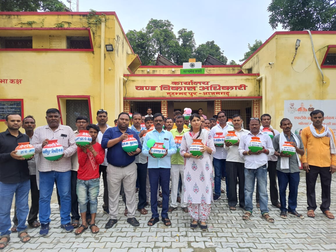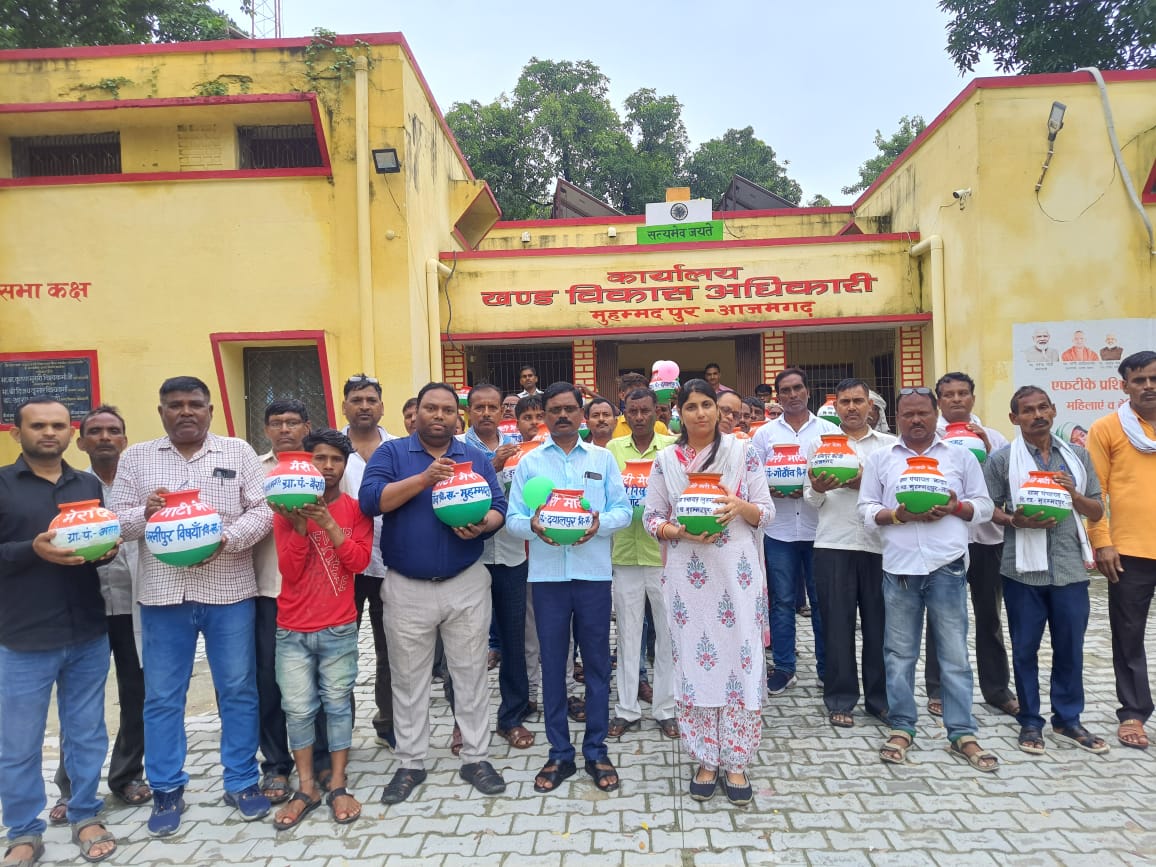 मेरी माटी, मेरा देश कार्यक्रम के तहत ब्लाक मुहम्मदपुर में कलश यात्रा गाजे बाजे के साथ निकाली गई जो विभिन्न गांव से होकर ब्लॉक मुहम्मदपुर में पहुंची जहां पर स्वतंत्रता संग्राम सेनानी के बने शिलापट्ट पर नतमस्तक हुई। बताते चले कि पूर्व निर्धारित कार्यक्रम के तहत 21 गांव की कलश यात्रा गाजे बाजे के साथ नंदाव ,असाढा, गोसड़ी ,गोठाव, इनावभार, कमरावा, परशुरामपुर, नगवा चक मुक्ति ,अरारा ,रीवा, गंगापुर काजी, लुहसा मुबारकपुर, गंभीरपुर ,सिंघड़ा, उत्तरगावां, कलंदरपुर,बसिरहां, हुसेपुर ,दयालपुर, धरनीपुर बिसयां आदि गांव से चलकर मुहम्मदपुर पहुंची जहां पर ब्लाक में सुरक्षित रखा गया। खंड विकास अधिकारी डॉक्टर आराधना त्रिपाठी ने बताया कि मेरी माटी मेरा देश के तहत 3 अक्टूबर से 11 अक्टूबर तक विभिन्न गांव से कलश यात्रा निकाली जाएगी जिसका उद्देश्य स्वतंत्रता संग्राम सेनानियों को याद करना ,साथ ही साथ लोगों में देशभक्ति की भावना जागृति करना है ।इस अवसर पर मुख्य रूप से खंड विकास अधिकारी डॉ आराधना त्रिपाठी, एडीओ पंचायत श्रवण कुमार , प्रधान जुल्मधारी यादव,मंतोष यादव, आनंद सरोज ,राकेश यादव, नागेंद्र प्रसाद ,जेपी यादव ,ऋषिकेश प्रजापति, लालधारी, खण्ड प्रेरक अजय सिंह,हरिकेश,सुरेश कुमार गौतम,राम जनम गुप्ता, बिरेन्द्र यादव ,आदि लोग उपस्थित थे।