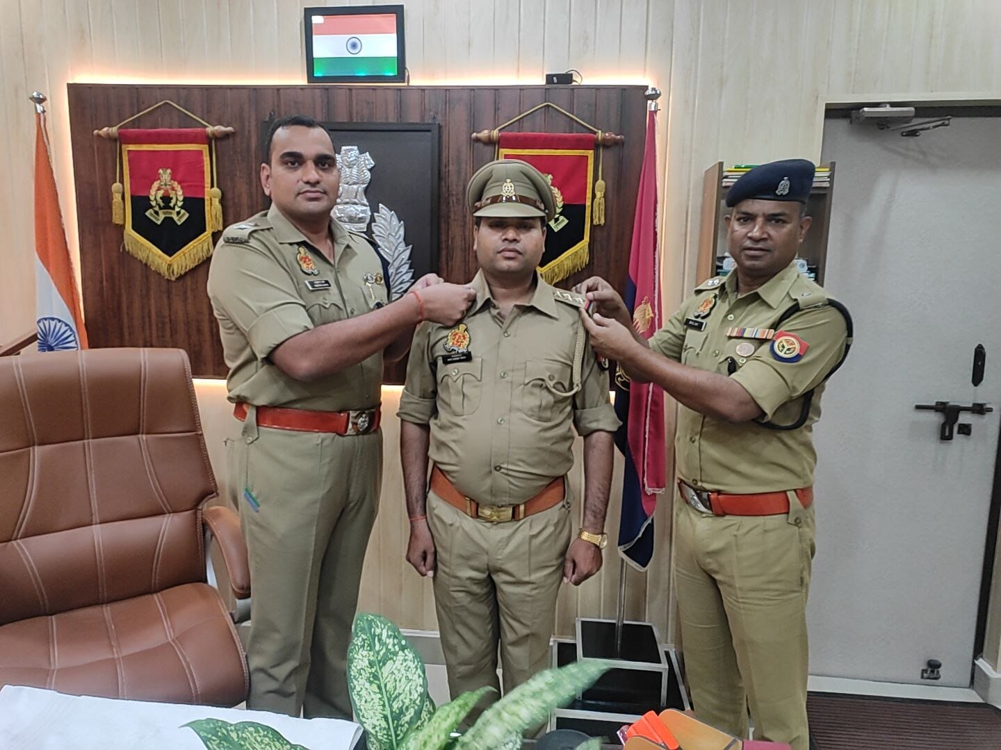आजमगढ़। पुलिस महानिदेशक, उत्तर प्रदेश द्वारा अनुमोदित किये जाने के फलस्वरूप जनपद आजमगढ़ के पुलिस उप-निरीक्षक (गोपनीय) स्टेनों को पुलिस निरीक्षक गोपनीय के पद पर पदोन्नति प्रदान की गयी। जिसके क्रम में आज 29 अगस्त को पुलिस अधीक्षक आजमगढ़ अनुराग आर्य व अपर पुलिस अधीक्षक नगर शैलेन्द्र लाल द्वारा कैम्प कार्यालय आजमगढ़ में उप-निरीक्षक (गोपनीय) सत्य प्रकाश पटेल के कंधों पर तीन स्टार लगाकर बधाई दी गयी।बताते चलें कि मुख्यमंत्री योगी आदित्यनाथ की अनुमति के बाद प्रदेश पुलिस के 117 निरीक्षकों को पुलिस उपाधीक्षक के पद पर प्रोन्नत कर दिया गया है। प्रमुख सचिव गृह संजय प्रसाद ने इसकी जानकारी दी। बता दें कि इन निरीक्षकों को पुलिस उपाधीक्षक के पद पर प्रोन्नत करने के लिए विभागीय प्रोन्नत समिति की बैठक में सहमति बनी थी, जिसके बाद पत्रावली मुख्यमंत्री के अनुमोदन के लिए भेजी गई थी। इसी कड़ी मे इन लोगों को प्रोन्नत किया गया है?अतुल कुमार अग्निहोत्री, सच्चिदानंद त्रिपाठी, राम शंकर तिवारी, सुधाकर मिश्र, संजीव कुमार त्यागी, लक्ष्मी सिंह चौहान, रवींद्र कुमार वर्मा, अनुज कुमार, कृष्ण मुरारी दोहरे, उदय प्रताप सिंह, आदेश कुमार, राजेश श्रीवास्तव, संजीव कुमार, जयकरन, मो. शारिक खां, अजय सिंह, संजय सिंह, शिव कुमार गौड़, एहतिशामुद्दीन सिद्दीकी, विवेक शर्मा, अनीता चौहान, आलोक कुमार पाठक, राजवर्धन, राजीव कुमार गुप्ता, राजेश सिंह, बाबर रजा जैदी, संजय कुमार सिंह, श्याम सिंह, अवधेश कुमार सिंह, सीमा जादौन, अजय प्रताप सिंह, अंजू सिंह, अरूण कुमार राय, प्रद्युम्न कुमार सिंह, दीपक चतुर्वेदी, संजय कुमार जायसवाल, मुनेंद्र पाल सिंह, प्रमोद कुमार सिंह, विजय कुमार सिंह तोमर, अजय कुमार श्रोत्रिया, पवन कुमार चौधरी, दिनेश दत्त मिश्र, संजय गुप्ता, अजय कुमार त्रिवेदी, यशपाल सिंह, अजय कुमार सिंह, संजय कुमार सिंह, संजय कुमार मिश्रा, विजय कुमार सिंह, अनिल कुमार पांडेय, हरशरन शर्मा, पंकज लवानिया, सैयद नजमुल हुसैन नकवी, अभितोष त्रिपाठी, हर्ष कुमार शर्मा, मो. जावेद खां, विनोद कुमार, रामसेन सिंह, धर्मेंद्र कुमार राय, शशि प्रकाश शर्मा, राकेश प्रताप सिंह, योगेश शाह, आदित्य प्रकाश, राजेश कुमार सिंह, मंजय सिंह, शमशेर बहादुर सिंह, अतुल कुमार सिंह, अरूण कुमार सिंह, सरोज पांडेय, अर्चना गौतम, जय सिंह, प्रमोद कुमार राय, अर्चना सिंह, मधुप कुमार सिंह, सुनील कुमार सिंह, अनिल कुमार सिंह, अंजय कुमार सिंह, प्रफुल्ल कुमार गुप्ता, प्रतिमा सिंह, यादवेंद्र बहादुर पाल, मनोज कुमार शर्मा, जय राम सिंह, संजीव कुमार शर्मा, सुशील कुमार सिंह, राजाराम, राजेश कुमार श्रीवास्तव, दीपक शुक्ल, महेश कुमार गोले, प्रभात कुमार तिवारी, धर्मेंद्र सिंह, आसमा माजिद, ईश्वर चंद्र प्रधान, किर