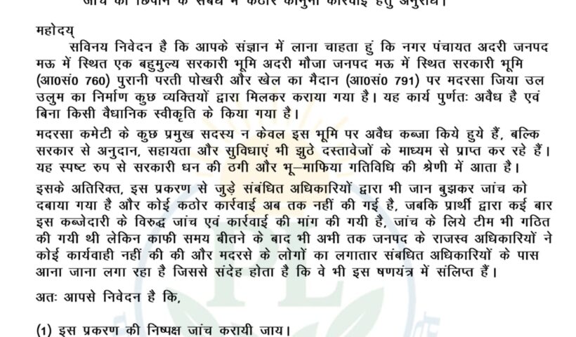 752 Viewsरिपोर्ट :जय प्रकाश श्रीवास्तव मऊ-उत्तर प्रदेश नगर पंचायत अदरी, जनपद मऊ में एक गंभीर भूमि अतिक्रमण के प्रकरण को लेकर परिवर्तन एक लक्ष्य समिति…