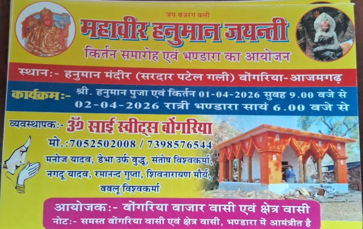 मेहनगर तहसील क्षेत्र के बोगरिया बाजार में सरदार पटेल गली में स्थापित एक प्राचीन हनुमान मंदिर जिसका जीर्णोधार बाजार के लोगों और समाजसेवियों के द्वारा किया गया है। जिसमें महावीर हनुमान जयंती के अवसर पर दिनांक एक अप्रैल 2026 दिन बुधवार से कीर्तन-भजन और दिनांक 2 अप्रैल दिन बृहस्पतिवार को महावीर हनुमान जयंती के शुभ अवसर पर बृहद भंडारे का आयोजन किया गया है। जिसमें बोगरिया बाजार के अलावा आसपास के और दूर दराज के भी क्षेत्रवासियों को आमंत्रित किया गया है।यह हनुमान मंदिर पूरी तरह से अपने नए रूप में दिखाई देगा। जिसमें कीर्तन रामायण, सुंदरकांड, हनुमान चालीसा का पाठ प्रत्येक शुभ अवसरों पर किया जाएगा। जिससे क्षेत्र के लोगों को खासकर हनुमान भक्तों को इस मंदिर के जरिए हनुमान जी की पूजा अर्चन करने का शुभ अवसर प्राप्त होगा। आयोजकों ने सभी क्षेत्रवासियों को इस भंडारे में आकर हनुमान जन्म उत्सव के प्रसाद को ग्रहण करने का आग्रह किया है।
