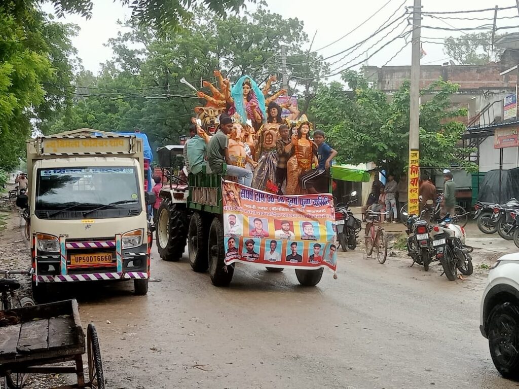 बोगरिया, आजमगढ़। मेंहनगर तहसील क्षेत्र के बोगरिया बाजार में दुर्गा माता के प्रतिमाओं की मूर्तियां रखी गई थी। शुक्रवार के दिन लगातार हो रहे बरसात के कारण विसर्जन का कार्य रोक दिया गया था। विसर्जन का कार्य आज शनिवार को बड़े ही धूमधाम के साथ संपन्न हुआ जिसमें महिलाओं और पुरुषों ने डीजे की धुन पर नृत्य किया साथ ही साथ लोगों की आंखों से आंसुओं की धाराएं भी बह रही थी। इसी क्रम में नव युवक दुर्गा पूजा समिति पूर्वी बोगरिया, दुर्गा पूजा समिति पश्चिमी की मूर्तियों का आज विसर्जन हुआ। इसे कहते हैं आस्था मानो तो देव नहीं तो पत्थर यह कहावत तो आप लोगों ने सुना ही होगा। नवरात्र के इस पावन पर्व पर बरसात में भी लोग भीगते हुए माता की प्रतिमाओं के दर्शन करने पहुंचें और प्रसाद ग्रहण कर माता को विदा करने के लिए लगभग दो किलोमीटर पैदल नंगे पांव महिलाएं भी चली गयी। बाद में लोगों ने उन्हें वापस किया और प्रतिमाओं को लेकर (मंगई नदी) रासेपुर गए और प्रतिमाओं को विसर्जित किया।