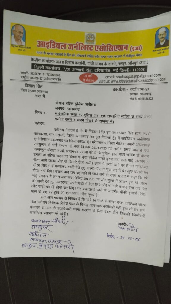 आजमगढ़ जिले के तरवां थाना क्षेत्र का मामला प्रकाश में आया है बताते चलें कि वाहन चेकिंग के दौरान एक युवक अपने दो पहिया वाहन से आ रहा था जैसे ही परमानपुर चौराहे पर पहुंचा तो कांस्टेबल सौरभ सिंह उप निरीक्षक दिनेश पाल ने गाड़ी रुकवाया युवक गाड़ी लगभग 5 मीटर दूरी जाकर सड़क के किनारे गाड़ी रोक दिया यह उनका नागवार लग गया और युवक के पास पहुंच कर बिना कुछ जांचे पूछे कांस्टेबल सौरभ सिंह ने गाली देते हुए ताबड़तोड़ मारना शुरू कर दिया मारपीट के दौरान युवक ने कहा कि मैं अच्छे परिवार से हूं मेरे भाई पत्रकार हैं मैं अपने भाई से बात करता हूं लेकिन कांस्टेबल ने युवक की एक भी ना सुनी गाली देते हुए गाड़ी में बैठा कर थाने ले जाकर थाने में बंद कर दिया जिसको लेकर आइडियल जर्नलिस्ट एसोसिएशन के जिला अध्यक्ष विशाल सिंह ने अपने पदाधिकारीयों सहित पुलिस अधीक्षक आजमगढ़ को ज्ञापन दिया और कहा कि अगर इस पर 24 घंटे के अंदर कार्रवाई नहीं होती है तो हम अपने पदाधिकारीयों के साथ धरना प्रदर्शन करने के लिए बाध्य होंगे जिसकी जिम्मेदारी संबंधित प्रशासन की होगी
